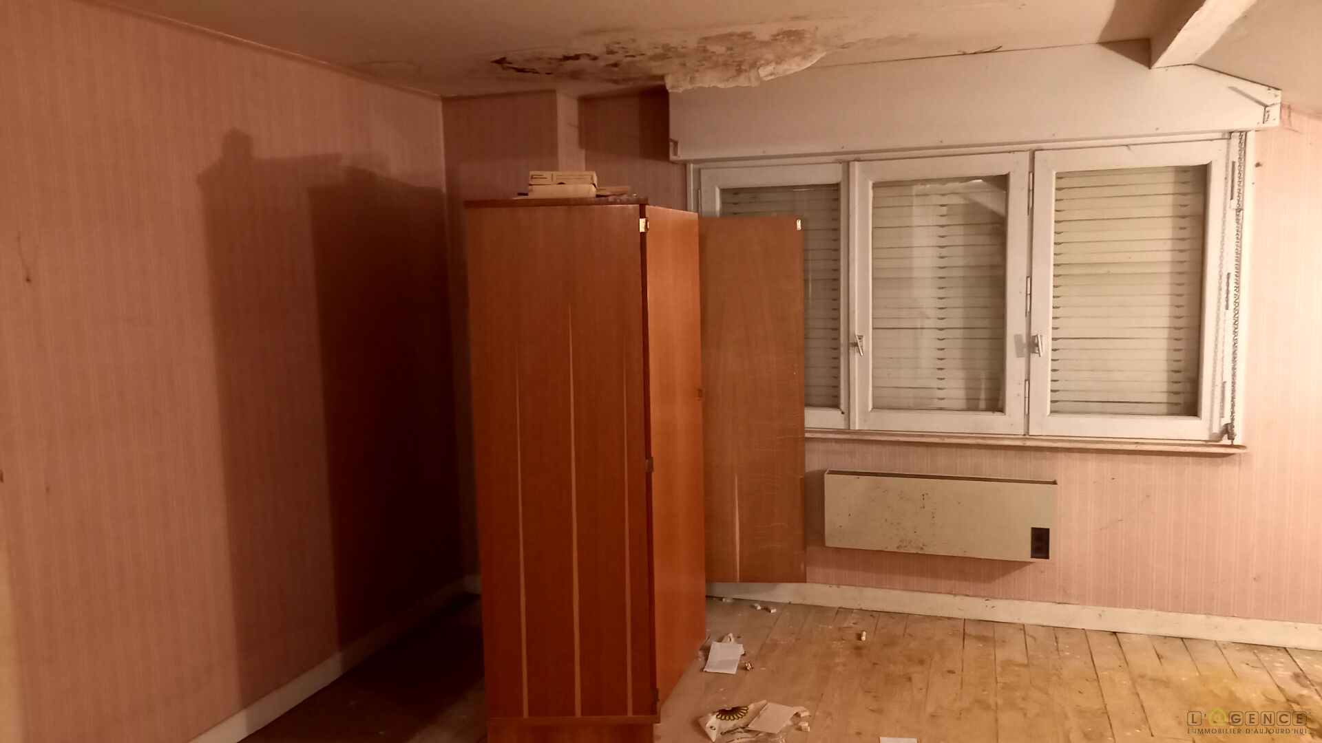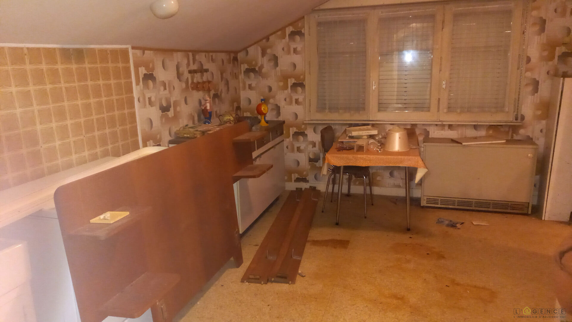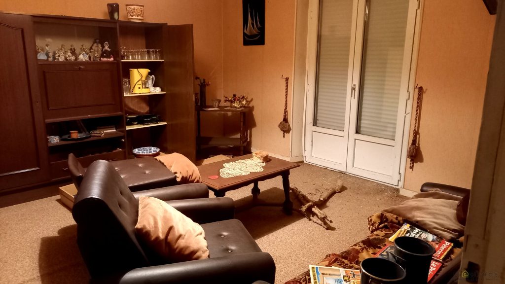 A l’étage : Dégagement, cuisine, salon/séjour, 1 débarras, wc avec lavabo
